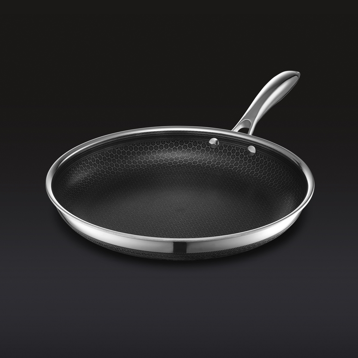 Die patentierte, sechseckig gemusterte Oberfläche besteht aus Edelstahlspitzen, die für eine perfekt gebräunte Oberfläche sorgen, und antihaftbeschichteten Tälern, in denen sich das Bratgut leicht löst und sich problemlos reinigen lässt. Der dreischichtige Boden mit magnetischem Edelstahl- und Aluminiumkern sorgt für eine schnelle, gleichmäßige Wärmeverteilung über die gesamte Kochfläche - auch bei gefüllter Pfanne.