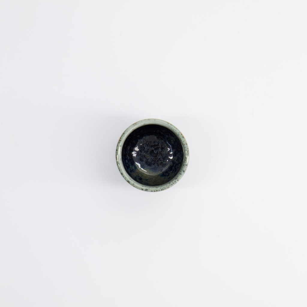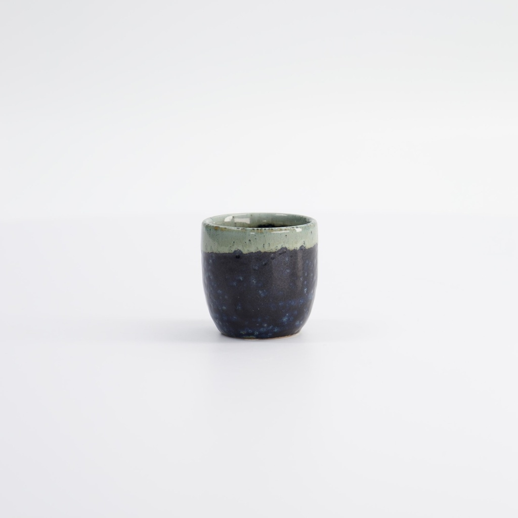 Die Oberfläche ist in einem tiefen Blau glasiert mit hellen, fast nebligen weißen Bereichen entlang des Randes. Dieser Kontrast unterstreicht die Klarheit des Getränks und schafft eine optische Vertiefung in der Tasse. Blau wird bei Sakebechern oft verwendet, um den Farbton des Getränks selbst zu betonen; bei Wettbewerben und Verkostungen ist blau-weißer Janome Choko üblich, aber hier wurde diese Technik auf einen rustikaleren, handwerklichen Ausdruck übertragen.