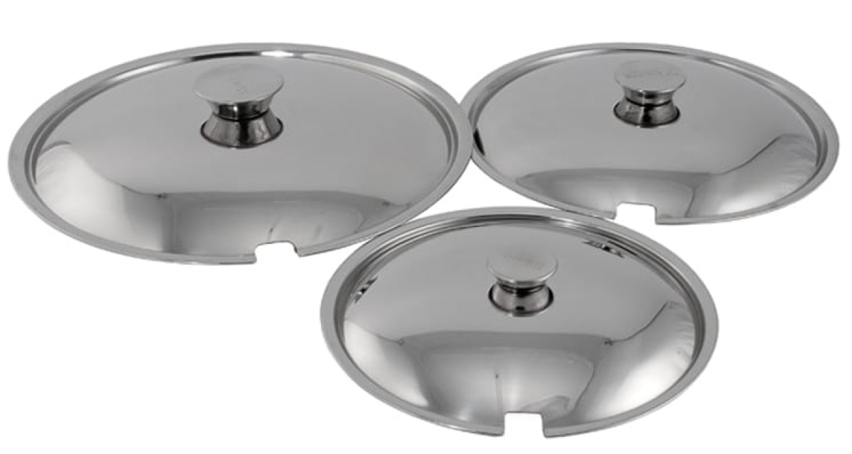 Komplett aus Edelstahl. Passend für die Suppenterrine mit der Artikelnummer os-43130x. Erhältlich in sechs Größen. Auslauf für Schöpfkelle.