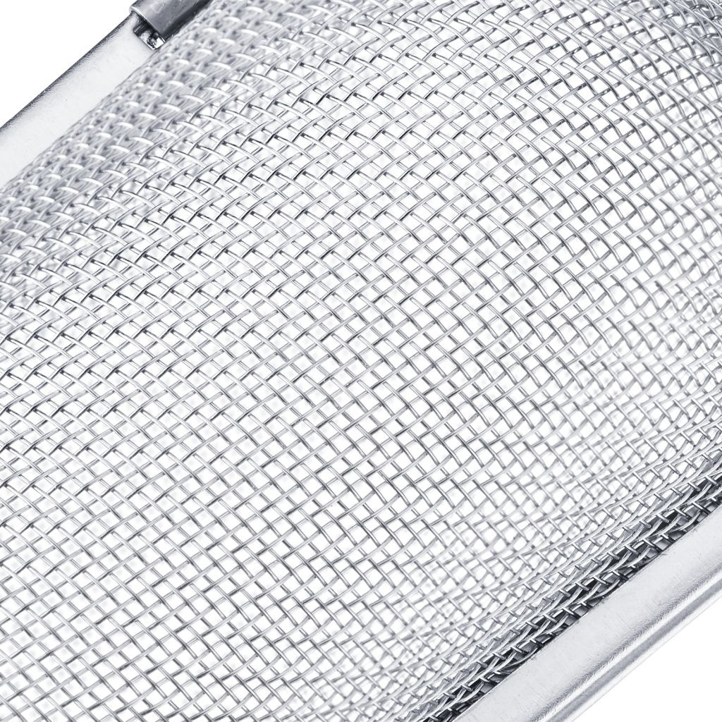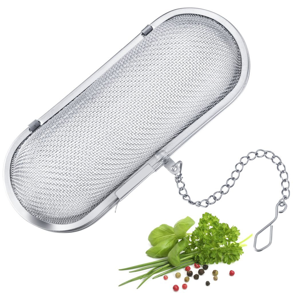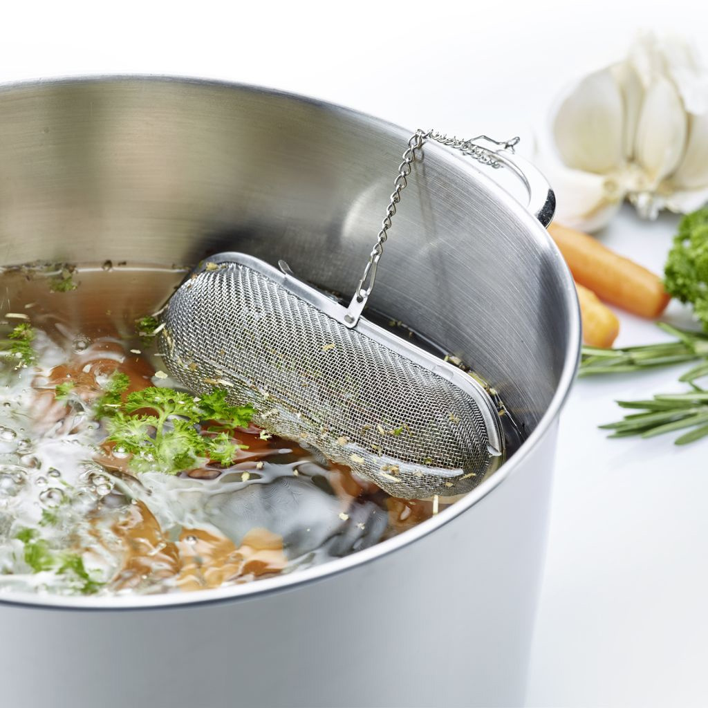 Mit ca. 11 cm Länge und mehr als 4 cm Durchmesser hat das ovale Gewürzsieb die ideale Größe für die Aufbewahrung von Gewürzen und Kräutern beim Kochen und eignet sich auch für die Zubereitung von Tee in einer entsprechend großen Kanne. Es lässt sich durch einfaches Öffnen des Deckels leicht befüllen und dank des seitlichen Verschlussmechanismus wieder fest verschließen. Die lange Kette mit integriertem Haken sorgt dafür, dass das Sieb während des Kochens nicht in den Topf fällt. Das praktische Edelstahlsieb ist sowohl für den Hausgebrauch als auch für die Gastronomie geeignet. Es ist geschmacksneutral und kann nach dem Gebrauch einfach in der Spülmaschine gereinigt werden.