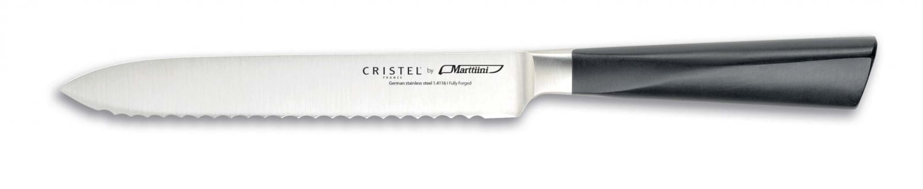 Gezahntes Messer von French Cristel. Der Griff ist aus Polyoxymethylen gefertigt, das leicht zu pflegen ist und sich im Laufe der Zeit bewährt. Das Design ist modern und die Messer sind in Gewicht und Design gut ausgewogen. Cristel hat diese Messer zusammen mit dem finnischen Unternehmen Marttiini Marttiini entwickelt - einem renommierten Hersteller von Jagd- und Angelausrüstung.