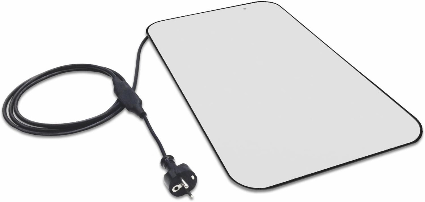 Temperaturbeständig bis 120°C und spritzwassergeschützt. Maße: 480×280×10 mm, Gewicht 1,2 kg. Anschluss 230 V.