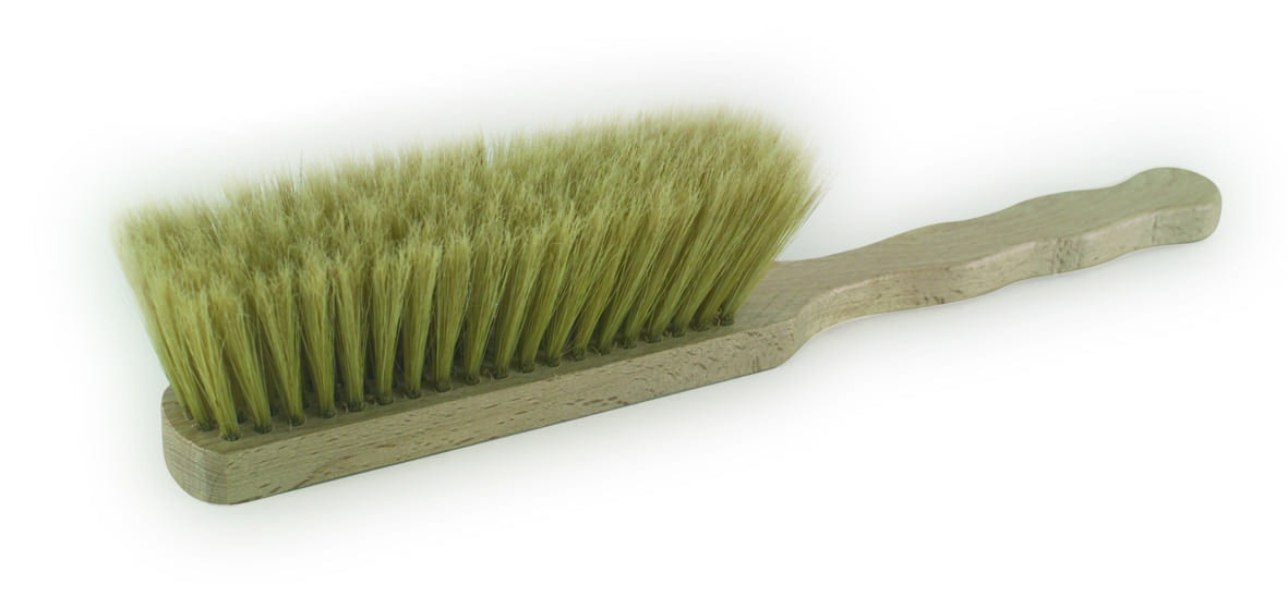 Eine hölzerne Bürste mit einem Griff aus dem italienischen Martellato. Er ist 40 cm lang und 4 cm breit.