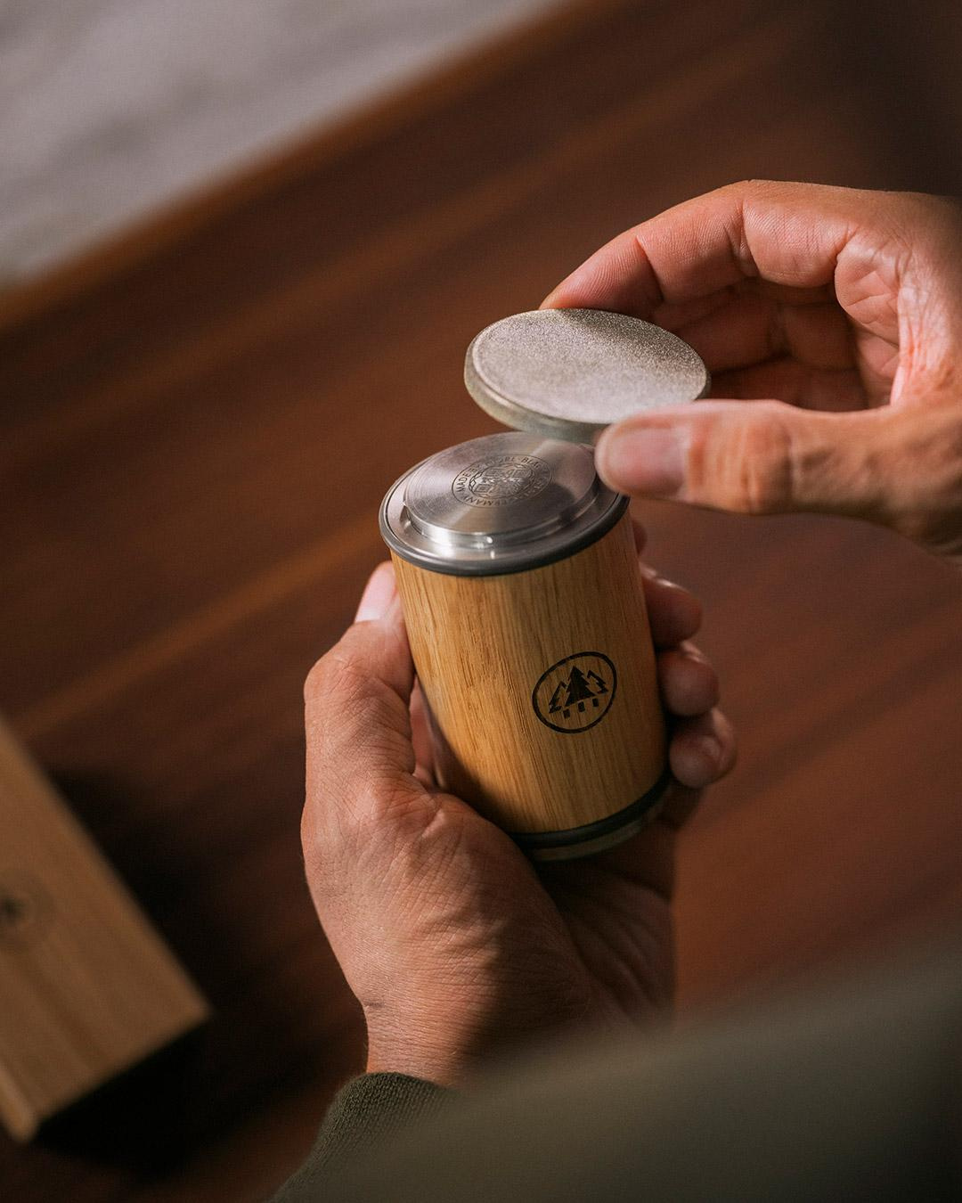 Wie bei den Vorgängermodellen wird ein Messer mit der Schneide nach oben an einer Seite des Magnethalters befestigt. Der Halter hat zwei Seiten mit unterschiedlichen Winkeln, eine mit 20°, die dem Schleifwinkel traditioneller europäischer Messer entspricht, und eine mit 15°, die bei japanischen Messern Standard ist. Dank der magnetischen Halterung ist der Winkel während des gesamten Schärfvorgangs fest und konstant, so dass Sie sich nicht drei übereinander gestapelte 25er-Ringe vorstellen müssen, um einen gleichmäßigen Winkel zum Schleifstein zu erhalten. Führen Sie die Walze einfach an die Messerkante heran und rollen Sie hin und her, um methodisch und vorsichtig die Schärfe Ihres Kochens wiederherzustellen.
