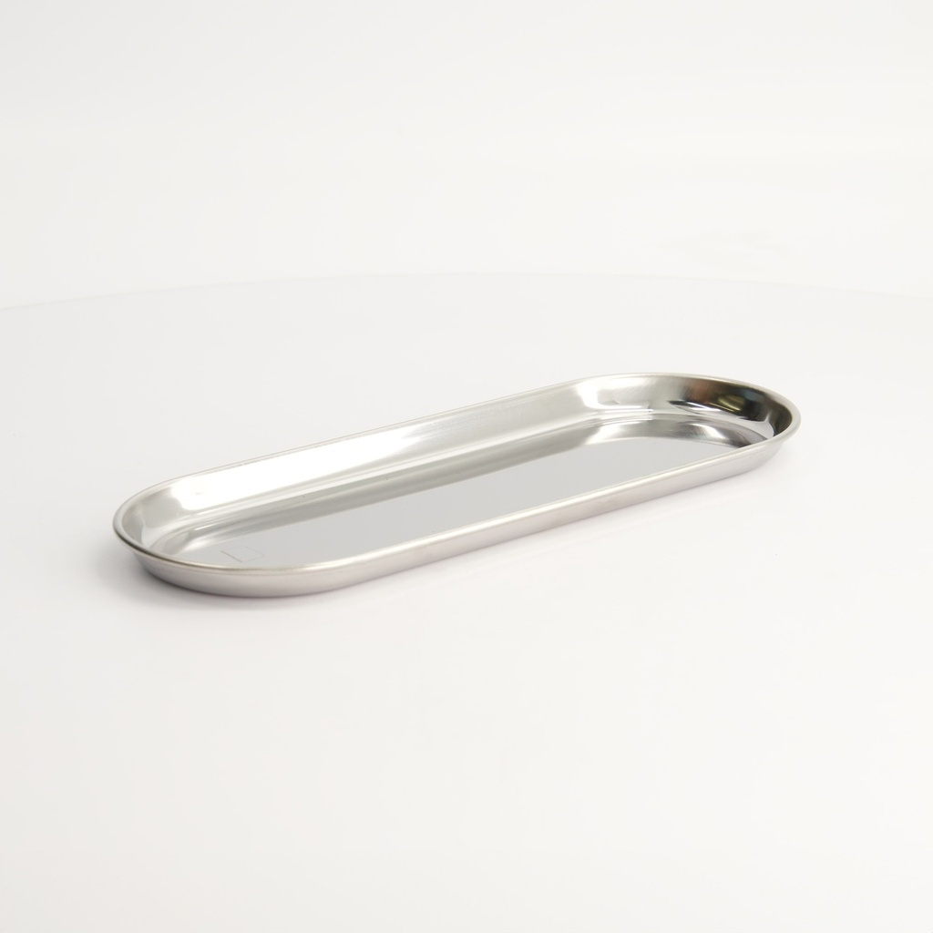 Ein einfaches Tablett aus Edelstahl, das aussieht, als gehöre es in einen Operationssaal, was nicht ganz falsch ist.