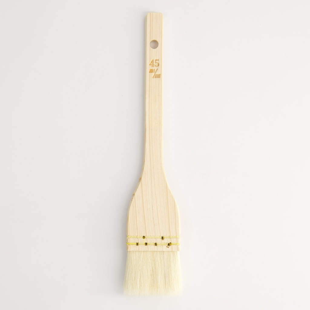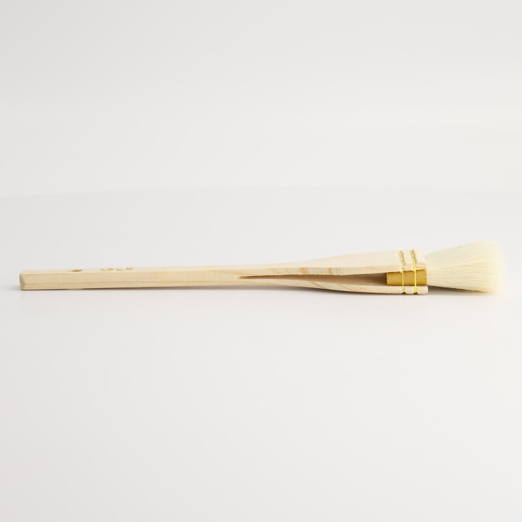 • Ein klassischer japanischer Kochpinsel, uchiwa bashi, aus handgeknüpften Ziegenborsten und einem unbehandelten Holzgriff. Er wird traditionell zum Auftragen von Tare (Soße) auf gegrillte Spieße wie Yakitori oder Kushiyaki verwendet, eignet sich aber ebenso gut zum Glasieren, Einölen von Gusseisen oder Backen.