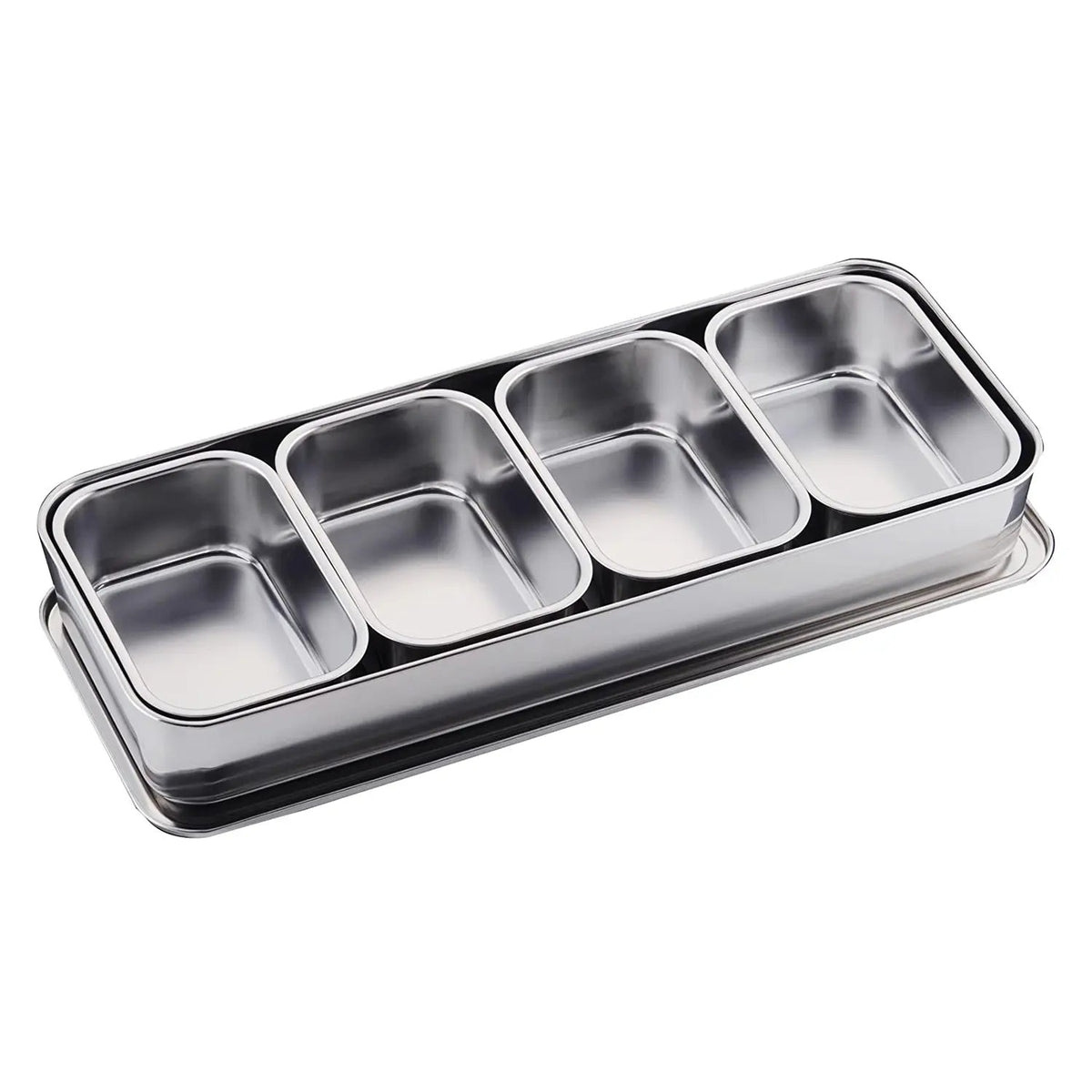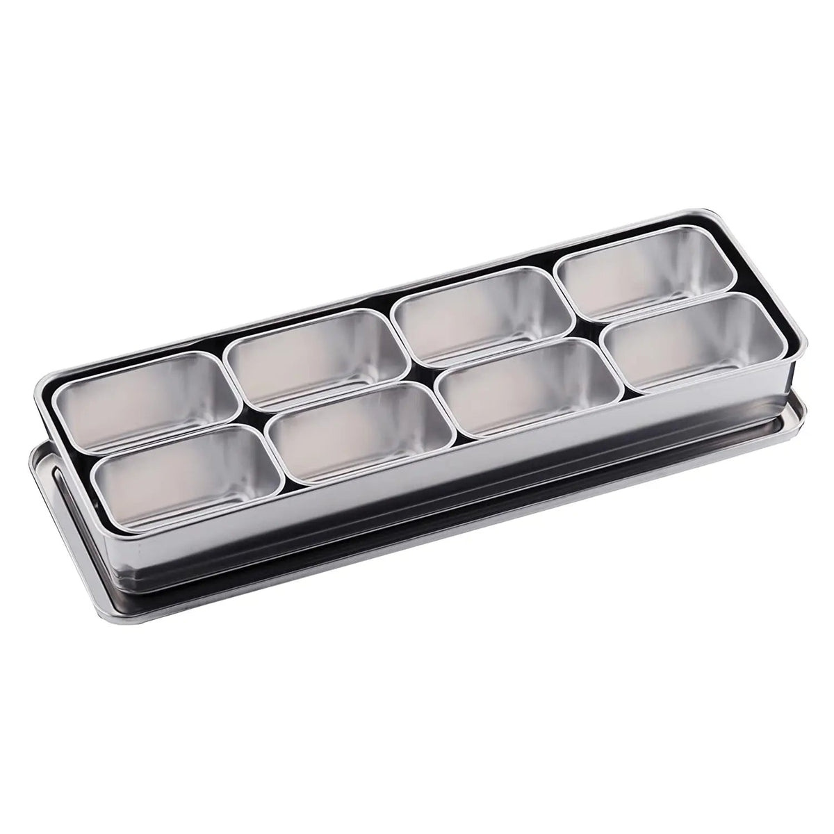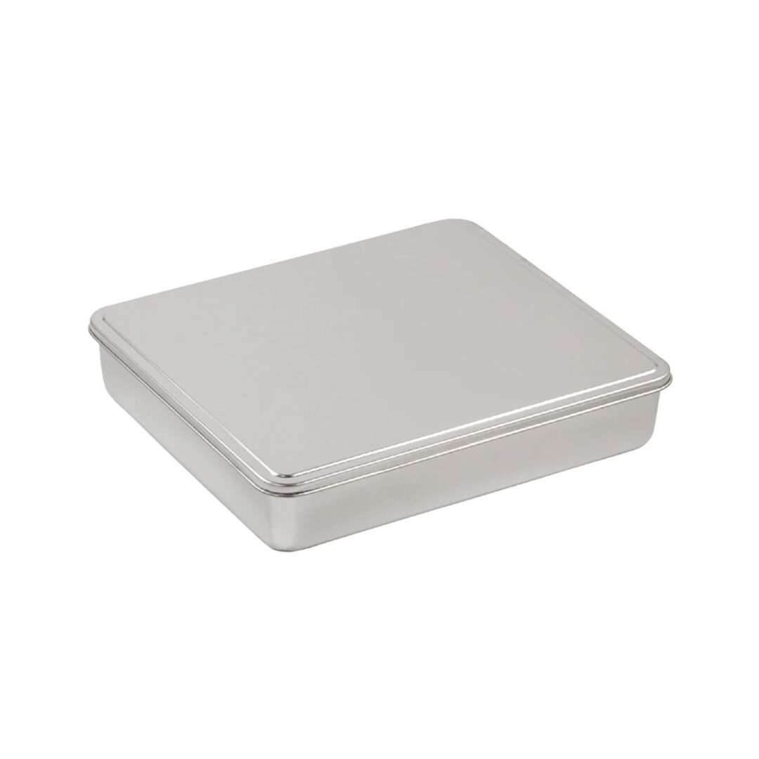 • Hübsches Tablett aus rostfreiem Stahl zur Aufnahme von Mise-en-place-Kantinen. Das Tablett wird mit Deckel geliefert, jedoch ohne die passenden Kantinen. Sie können Ihr perfektes Set-up selbst zusammenstellen und Größen nach Belieben mischen (wir urteilen nicht). Eine L-Kantine entspricht zwei S-Kantinen im Flächenmaß, daher sind die Möglichkeiten vielleicht nicht endlos, aber sehr groß (laut unseren Berechnungen sind sieben Kombinationen auf dem XL-Tablett möglich – oder 233, wenn man die Anordnung mit einbezieht!!).