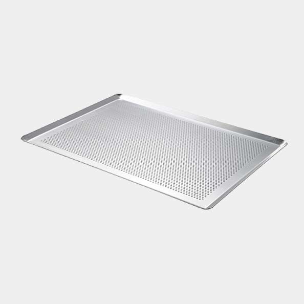 Gelochtes Hohlblech mit gefalteten Kanten. Hergestellt aus Aluminium. Wird hauptsächlich in Heißluftöfen für Backwaren verwendet, denen man Luft und damit Knusprigkeit verleihen möchte, wie z. B. französisches Brot, Baguettes, Torten oder Gebäckstücke. Funktioniert auch als normales Backblech in Kombination mit einer Silikonmatte. Erhältlich in drei Größen: 40 x 30 cm, 53 x 32,5 cm (GN 1/1) und 60 x 40 cm.