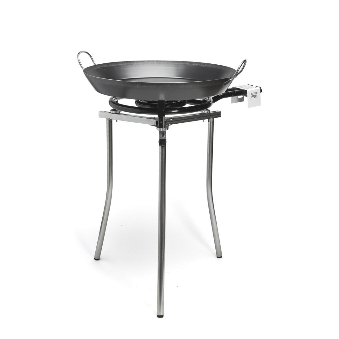 • Dreibein aus Chromstahl für Paellapfannenbrenner. Passt für alle de Buyers Größen von Brennern und Palettengewichte bis zu 60kg. 66,5cm hoch. Das Bild zeigt auch den Brenner und die Pfanne, diese sind nicht enthalten, aber der Preis bezieht sich nur auf den Ständer.