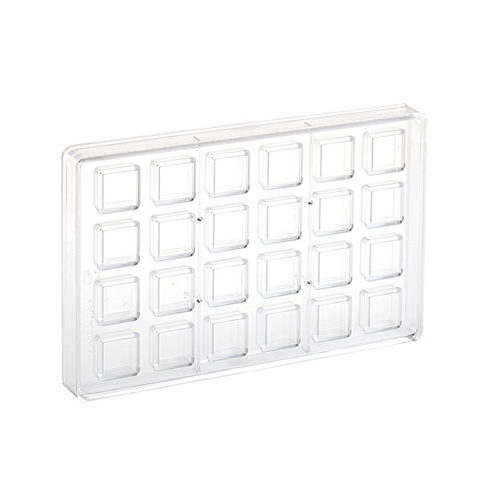 Pralinenform aus Hartplastik, die quadratische Blöcke herstellt. Jede Form bietet Platz für 24 Pralinen à 9 g. Die Form ist 275 x 175 mm groß.