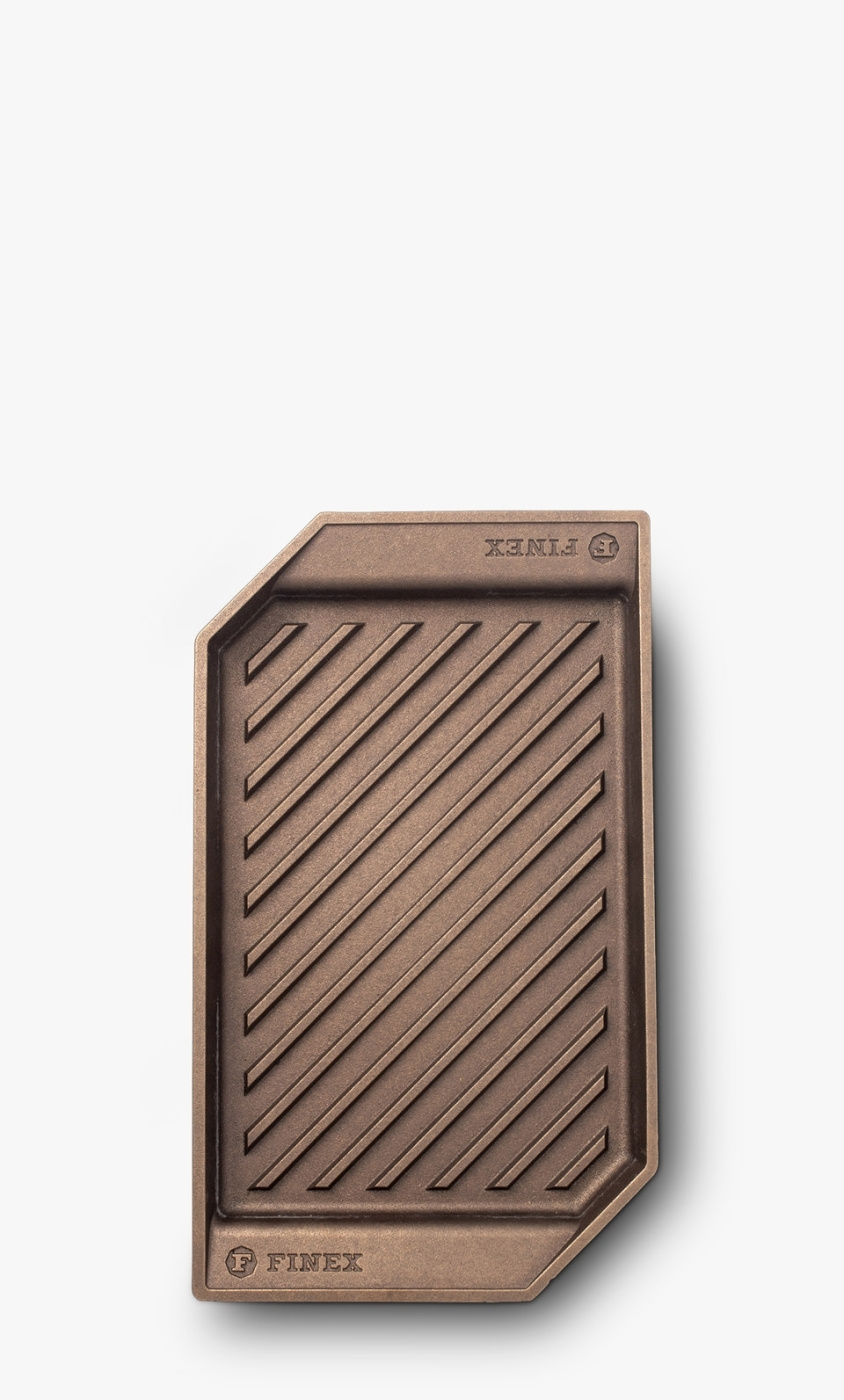 • Gusseiserne Bratplatte von American Finex, der Schwesterfirma von Lodge. Ihre gusseisernen Produkte sind von absolut höchster Qualität und setzen eine ganz neue Messlatte für Küchengeräte. Mit ihrer Dicke, ihrem Design, ihrer Verarbeitung, ihren Griffen usw. sind sie unvergesslich, wenn man mit ihnen arbeitet, aber wirklich unvergesslich vom ersten Blick an. Die Bratplatte wird in der Fabrik mit Leinöl eingefettet, was ihr eine gute Haltbarkeit verleiht und auch zur besonderen Bronzefarbe beiträgt. Da sich die Amerikaner hartnäckig weigern, das gleiche Maßsystem wie der Rest der Welt zu verwenden, hat sie ein etwas verrücktes Format. Funktioniert auf dem Herd genauso gut wie auf dem Grill, perfekt für Burger!