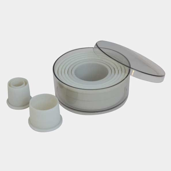 Die Packung enthält neun Größen in der gleichen Form. Sie sind aus verstärktem Polyamid-Glasfaser hergestellt, was sie auch in professionellen Umgebungen langlebig und strapazierfähig macht. Das bedeutet auch, dass sie keine Nahtstelle wie andere Stanzringe haben, so dass Sie sich keine Sorgen um Nähte an Ihren Backwaren machen müssen. Sie sind unten dünn und scharf und oben dick und bequem. Sie sind spülmaschinenfest und können sterilisiert werden.