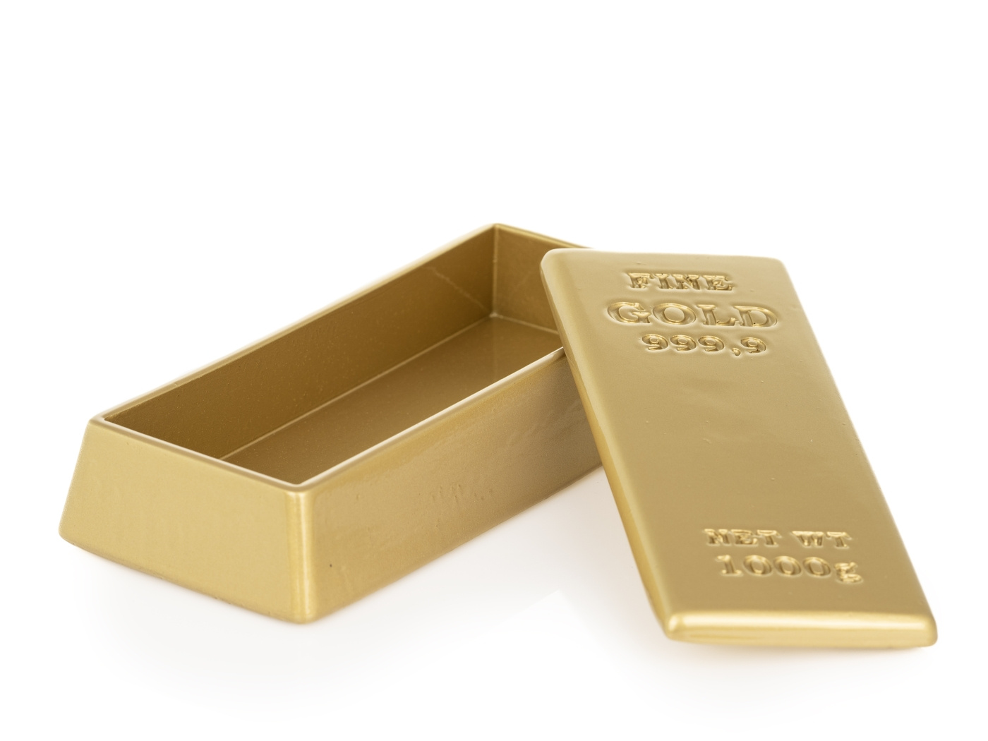 Servierschale aus Kunstharz, die in einer realistischen Interpretation eines schweren Goldbarrens gegossen wurde. Öffnen Sie den Deckel und servieren Sie daraus Pralinen, Petit Fourer, russischen Kaviar oder Cornflakes, oder lassen Sie ihn auf Ihrem Profilbild bei Tinder erscheinen, um potenzielle Partner zu beeindrucken. Erhältlich mit Ihrer eigenen Beschriftung bei einer Bestellung von mindestens 20 Stück, kontaktieren Sie uns für den Preis.