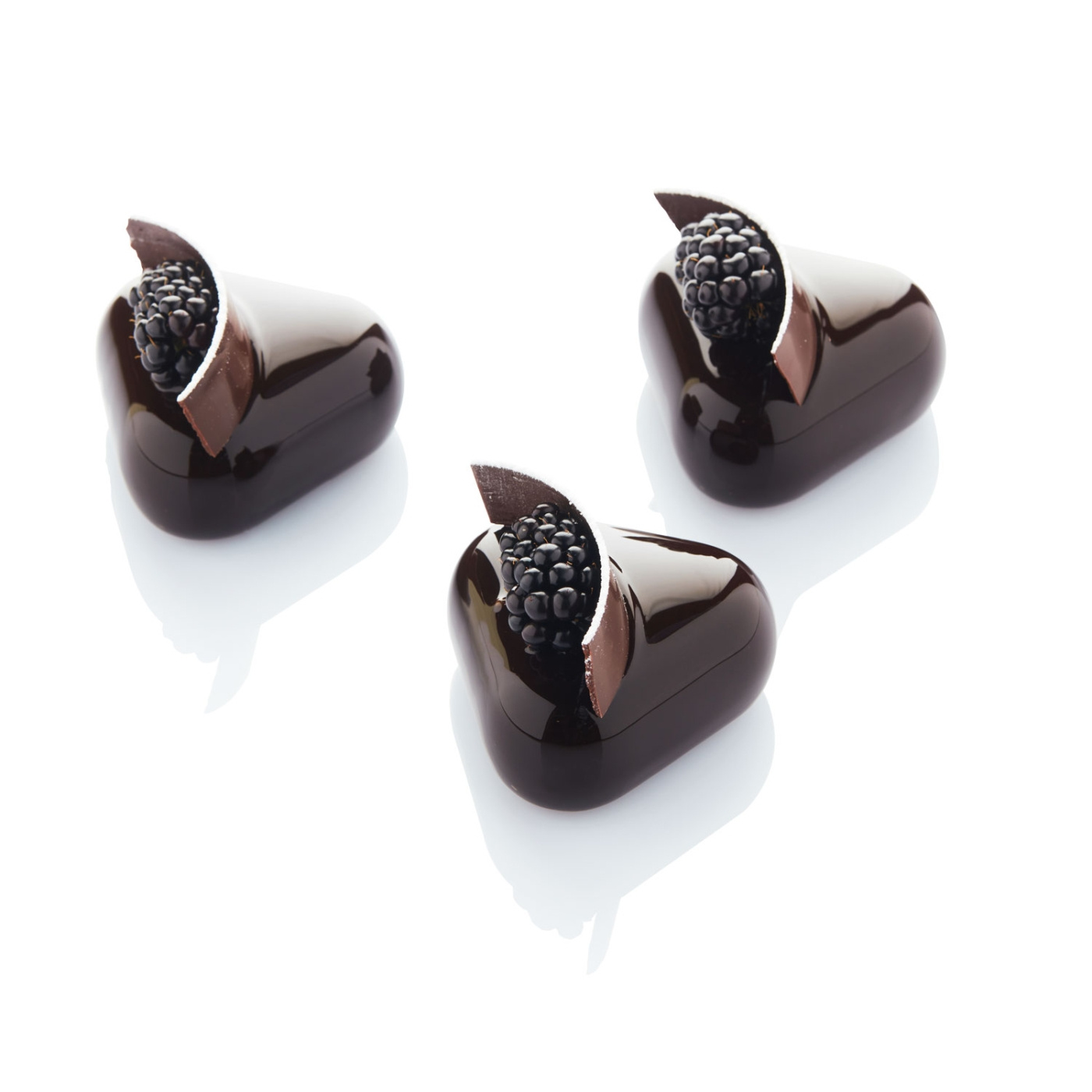Aus dem Martellato-Sortiment schwarzer Silikonformen, die etwas stilvoller, luxuriöser und moderner sind, stellen wir Ihnen Triangle vor, das Ihnen Dreiecke bietet. Die Formen haben eine schöne Rundung und eignen sich hervorragend zum Übergießen von Gebäck. Das Gebäck misst 71,5 x 67 mm und ist 35,5 mm hoch (Volumen 104 ml). Die Form hat eine Größe von 297x176 mm. Jede Form bietet Platz für sechs Torten und ist temperaturbeständig zwischen -60°C und +230°C.
