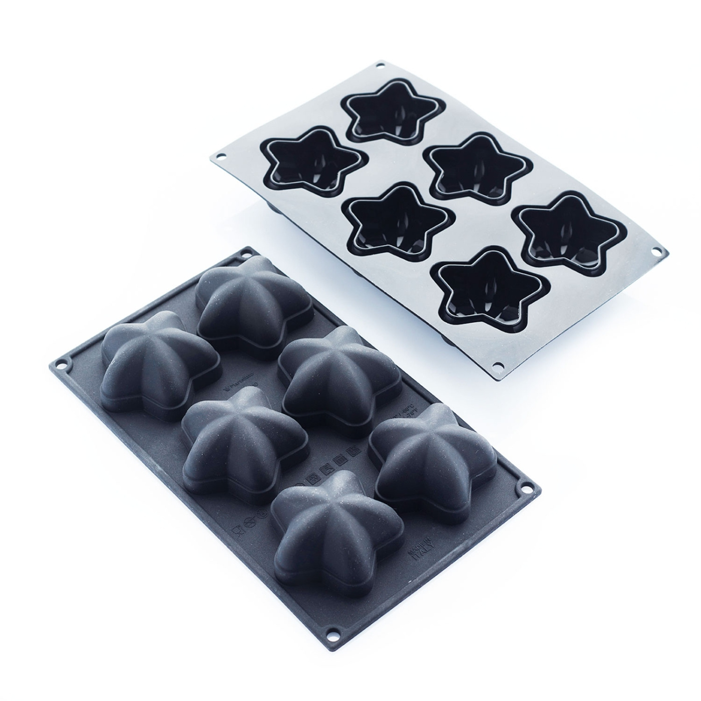 Aus dem Martellato-Sortiment an schwarzen Silikonformen, die etwas stilvoller, luxuriöser und moderner sind, präsentieren wir Marina, die Ihnen Sterne schenken wird. Die Formen haben eine schöne Wölbung und ergeben Kuchen, die sich hervorragend mit Glasur übergießen lassen. Die Torten haben die Maße 77x74 mm und sind 40 mm hoch (Volumen 105 ml). Die Form hat eine Größe von 297x176 mm. Jede Form bietet Platz zum Gießen von sechs Stück. Die Formen sind temperaturbeständig von -60°C bis +230°C.