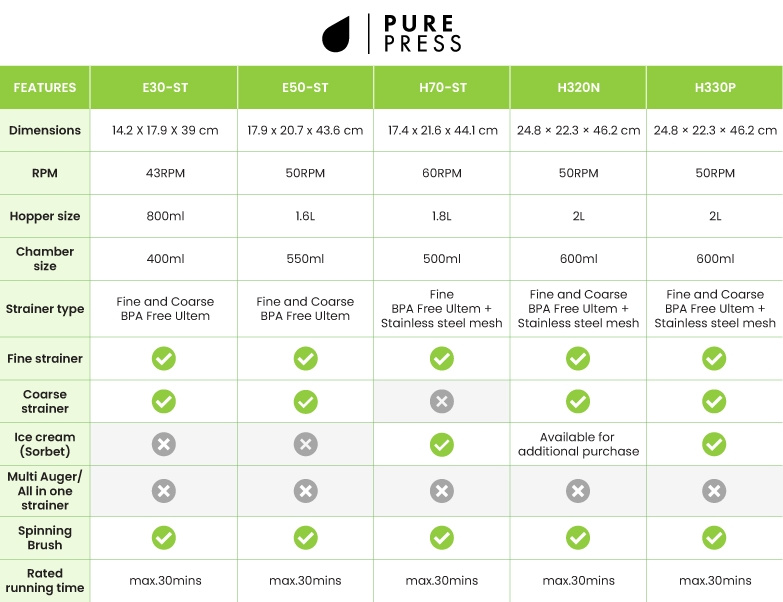Der H330P ist vielseitig einsetzbar und kann mehr als nur klassischen Saft herstellen, da seine Komponenten und das mitgelieferte Zubehör die Zubereitung von Saft, Nussmilch, Sorbet und Eis aus rohen wie auch gekochten Zutaten ermöglichen.