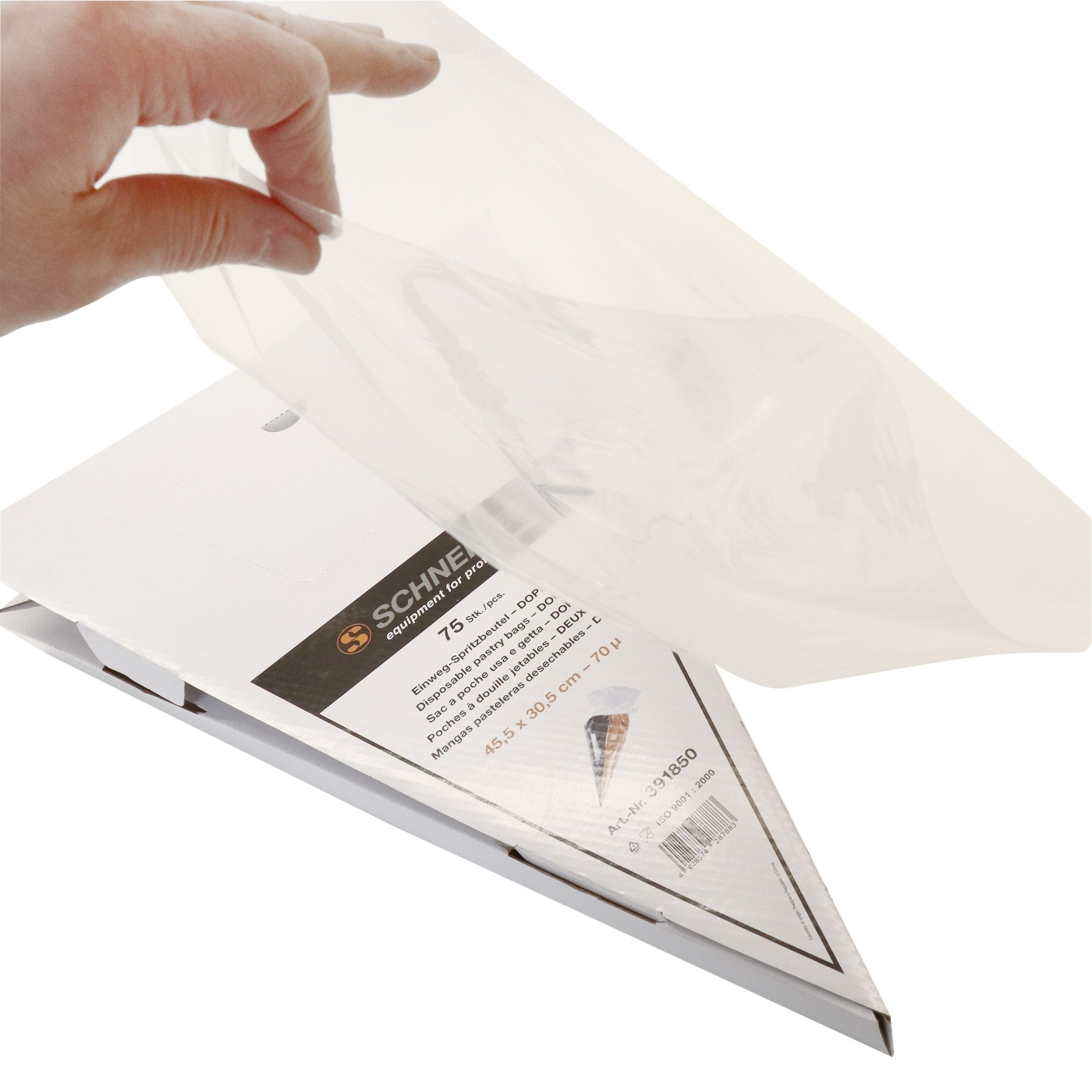 Doppelt extrudiertes Material mit glatter Innenseite und hoher Schweißnahtfestigkeit. Die Spitze ist geschlossen und der Beutel kann ohne Tülle verwendet werden. Transparent, gebündelt, 455×305 mm. Packung mit 75 Beuteln mit Entnahmeöffnung im Karton.