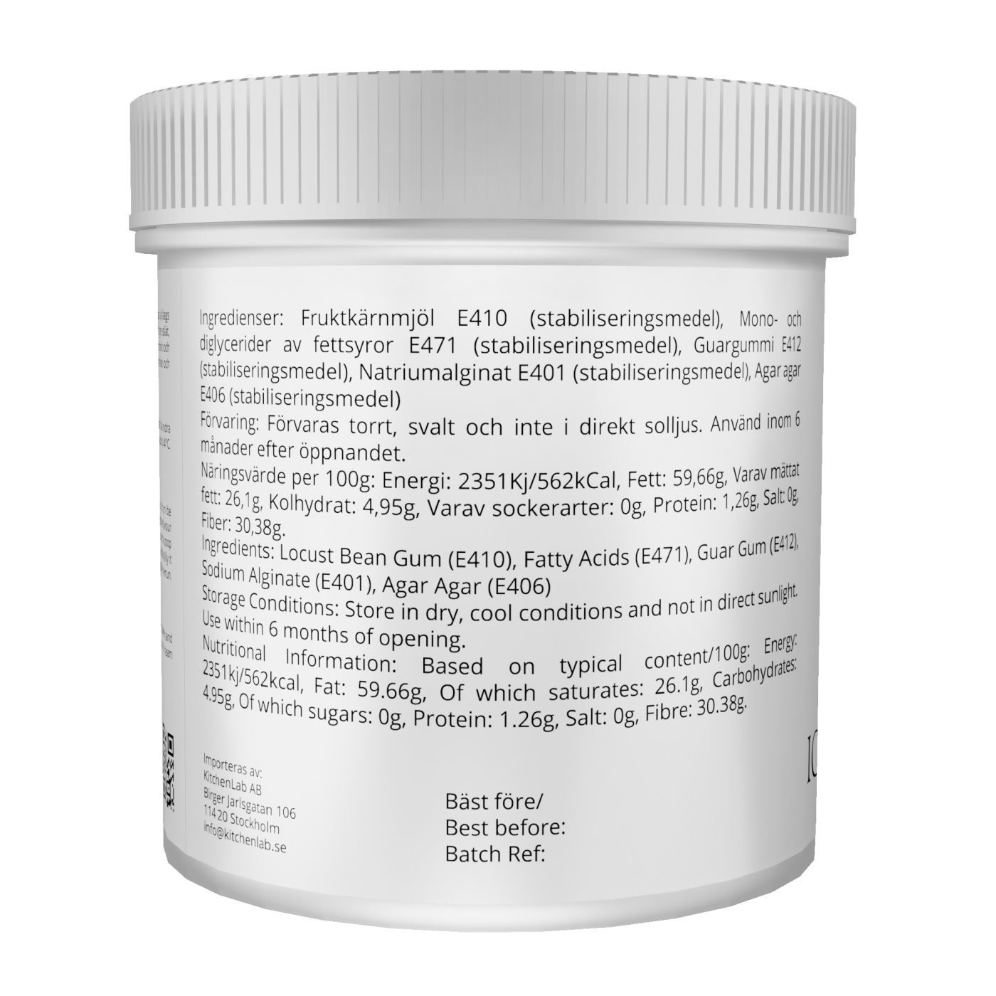 Fruchtkernmehl (E410), Mono- und Diglyceride von Speisefettsäuren (E471), Guarkernmehl (E412), Natriumalginat (E401), Agar-Agar (E406)