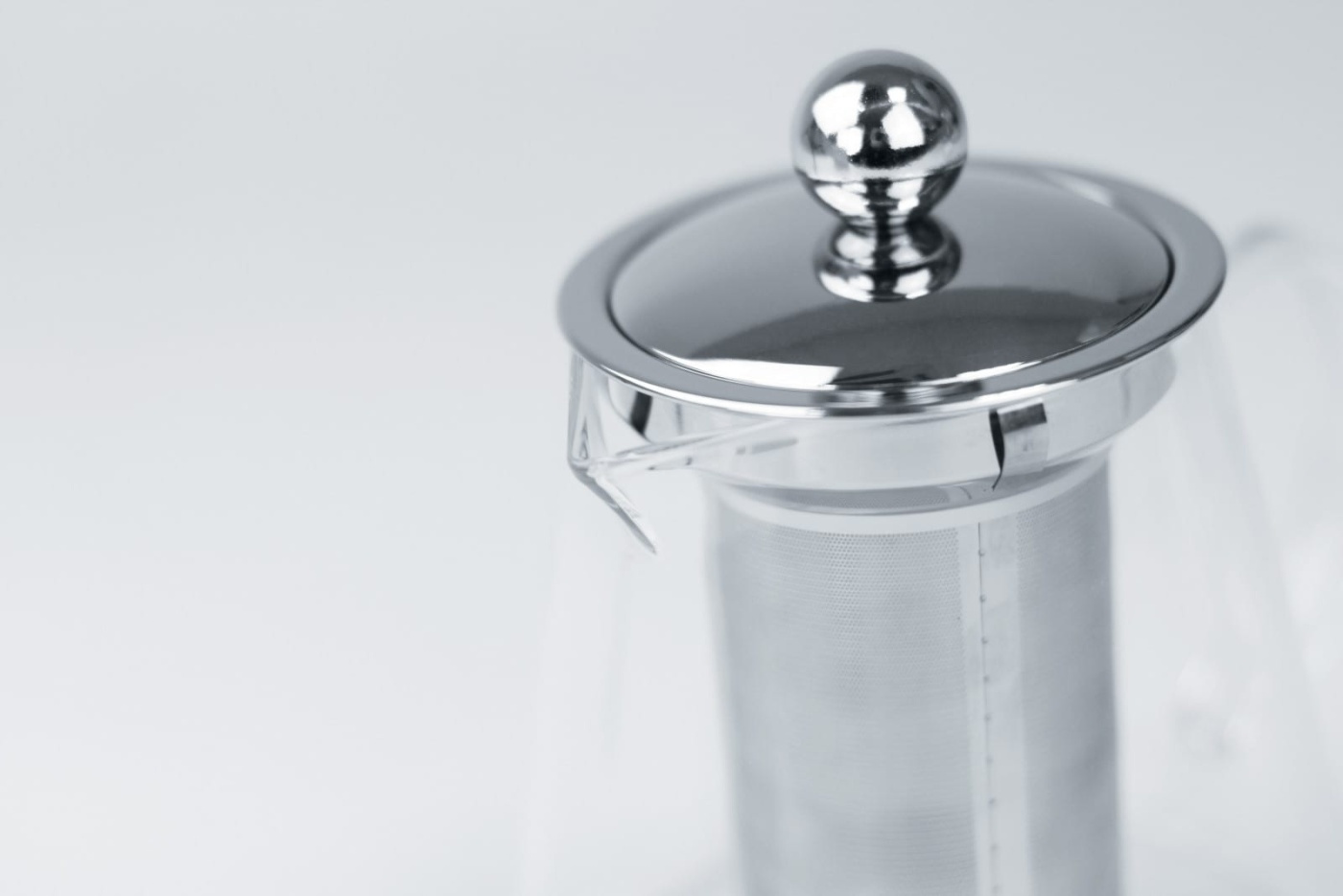 Glas-Teekanne von French Cristel. Dieses etwas geradlinigere und sauberere Modell wird als Oolong bezeichnet, soll aber auch für andere Teesorten geeignet sein. Der Ausguss ist so konzipiert, dass er nicht tropft, und alles, was nicht aus Glas ist, wie das Sieb und der Deckel, ist aus Edelstahl und kann zum Waschen zerlegt werden. Die Kanne ist in zwei Größen erhältlich: 0,8 Liter und 1,2 Liter. Die kleinere ist 16 x 16 x 12,5 cm groß, während die größere 16 x 19,5 x 13,5 cm misst.
