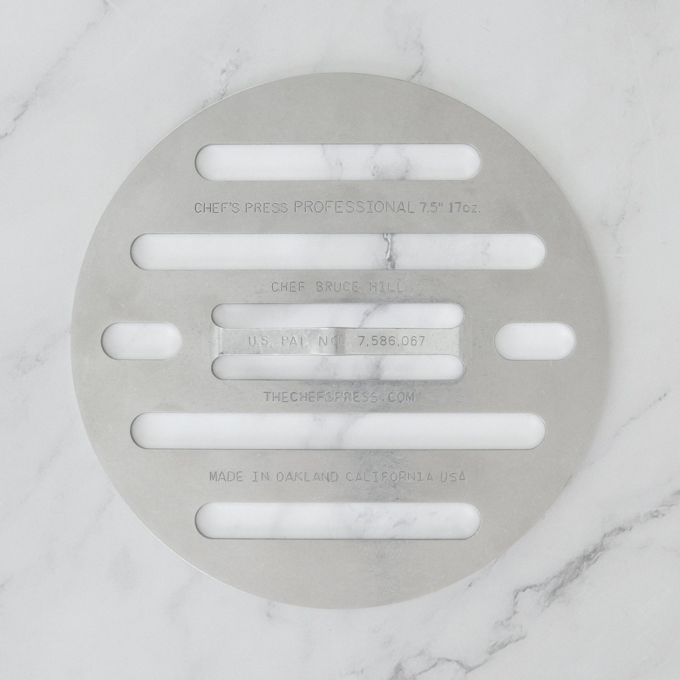 The Chef´s Press ist ein belüfteter Steakgewicht und ist in vier verschiedenen Gewichtsklassen erhältlich (eine runde). Chef Bruce Hill aus San Francisco befand nach vielen Jahren am Herd, dass die traditionellen Steakgewichte das Essen zu stark belasteten und der Dampf vom Essen zurückblieb und das Ergebnis verschlechterte. Mit The Chef´s Press können Sie auch das Gewicht regulieren, indem Sie ein oder mehrere Steakgewichte übereinander legen. Mit dem Steakgewicht verkürzt sich die Garzeit um ca. 20-30%, da mehr von dem Essen die Wärmeoberfläche berührt. Außerdem wird die Oberfläche des Essens gleichmäßiger und schöner. The Chef´s Press eignet sich gleichermaßen für Fleisch, Fisch und Gemüse. Der Preis gilt pro Stück.