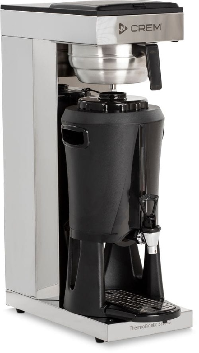 • Die Mega Gold M ThermoKinetic von Crem ist eine der meistverkauften Kaffeemaschinen der Welt. Ein schneller Brüher, der alles in eine Servierstation statt in eine Warmhalteplatte leitet, die dem Druck in einem Restaurant, Büro, Personalraum oder Café standhält.