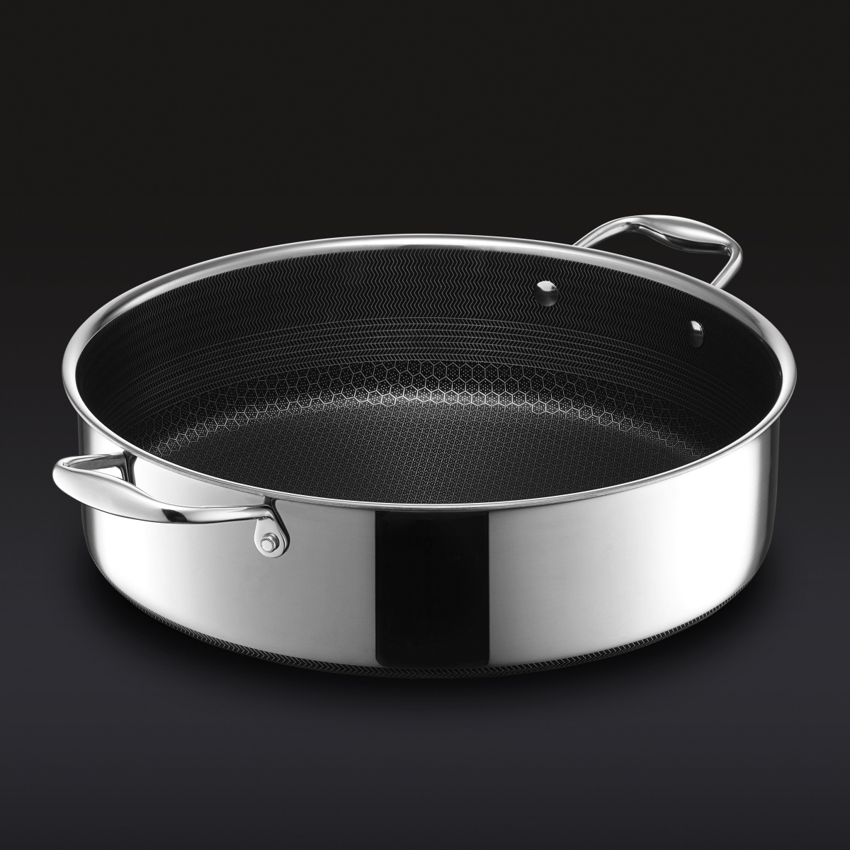 Die Hexclad Buffetpfanne kombiniert die Haltbarkeit von Edelstahl mit der leicht zu reinigenden Oberfläche einer Antihaftbeschichtung. Die einzigartige Hybrid-Konstruktion sorgt für gleichmäßige Hitze, eine angenehme Kochfläche und ermöglicht ein leichtes Ablösen der Speisen von der Oberfläche, während sie den Strapazen einer aktiven Küche standhält.